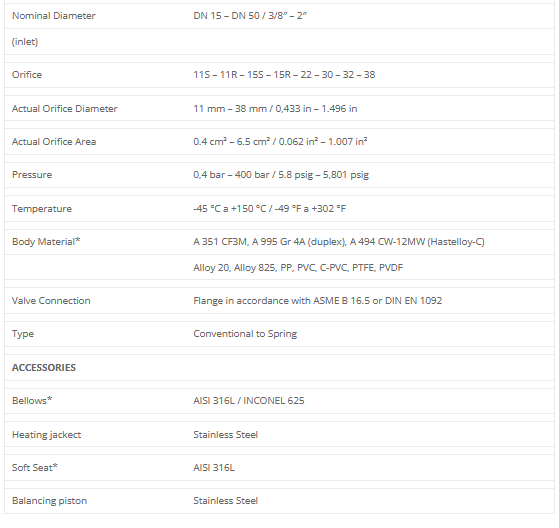 Available with GAS and NPT threaded connections or flanged in accordance with ASME B 16.5 or EN standard with sizes from ½ “to 2”, and set pressure up to 400 bar (1/2” valves).
