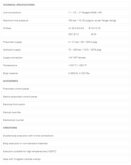 The most request configuration is “solid block” which provides the coupling of the shut down valves and the control valve in a single block. The valves have integral single-acting actuator, and may be made of carbon steel or stainless steel. Their strength is constituted by the tungsten carbide seat that ensure a high wear resistance.