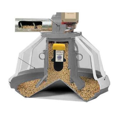 Using Blue tooth communication to the BTFS feed sensor. The BTFS feed sensor measure the feed in the last feed pan, when the feed level is below the feed sensor, a preset time delay starts. When the delay time is over the feed auger motor starts and fill up the feed line. When the control pan feed sensor is covered with feed it stop the auger motor