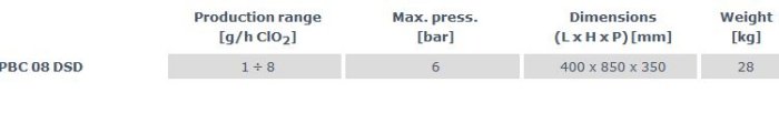 Line of generators for small productions equipped with a special reactor which provides 2% premix solution of chlorine dioxide output to reduced danger. In the basic version the system is very compact and can also be supplied in a cabinet closed and/or equipped with analysis instrumentation.