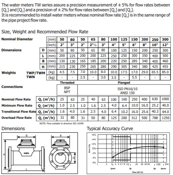 The TWP/TWM Series tangential watermeters are manufactured in cast iron (EN-GJL 250) or in ductile iron (EN-GJS 500) in order to work to a maximum nominal pressure of 16 bar (232 PSI).