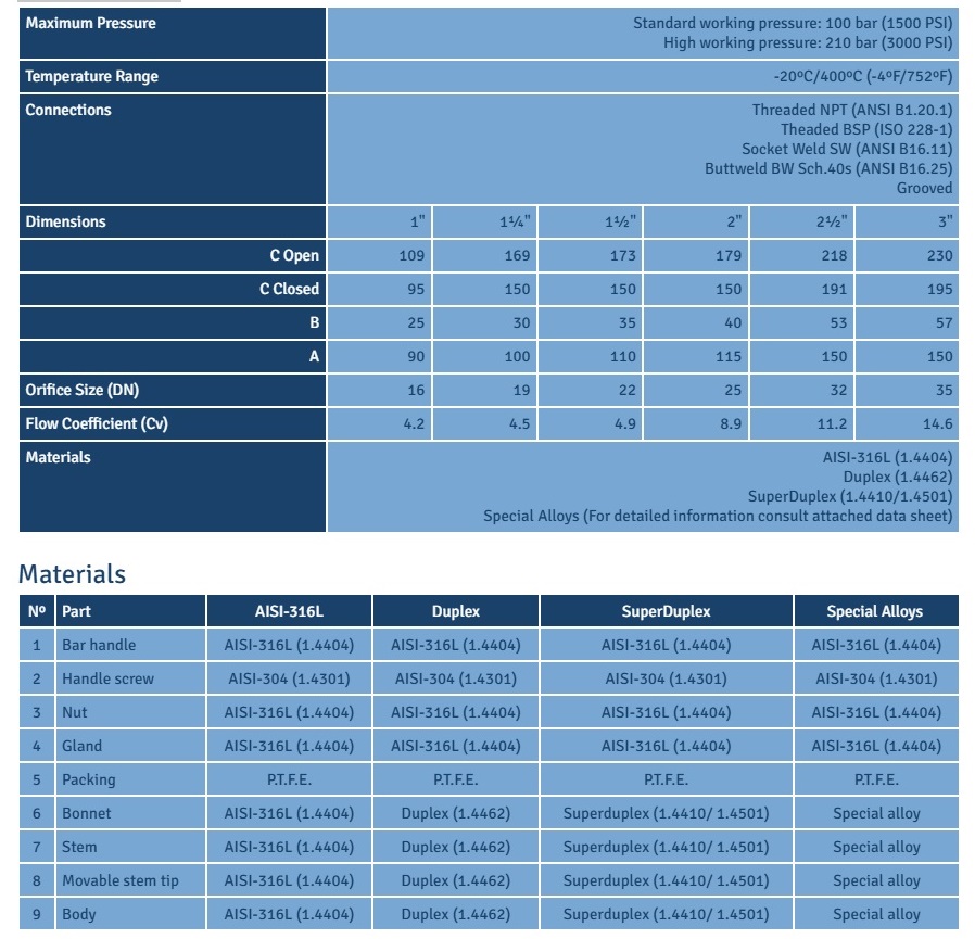 TECVAL CP-01 needle valves are designed to work with liquids under both high pressure and temperature service. The back-seat allows a free packing change while the valves are in service. They are for use in chemical plants, water treatment plants, refineries, laboratories and gas companies, as well as in the general industry.