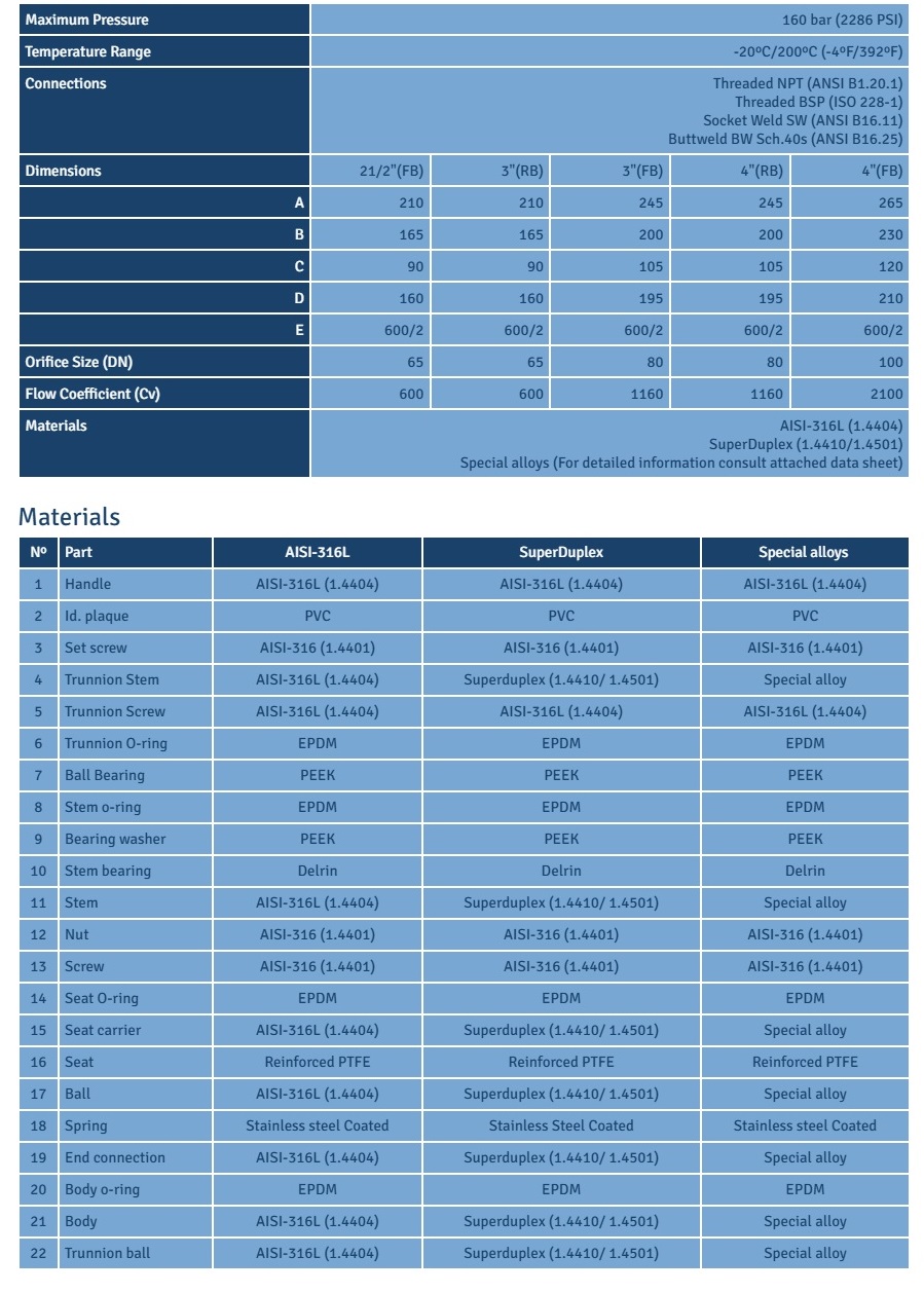 2-Way 3-Pieces Full(FB) or Standard(SB) Bore Trunnion Ball Valve Working Pressure 160 bar (2286 PSI). TECVAL VB-65 trunnion ball valves are designed to work with liquids under either high pressure or moderate vacuum service. Due to their trunnion solid design, these valves withstand extreme service conditions where the strongest features are required. To be used in numerous applications, they are manufactured in several sizes, connections and alloys.