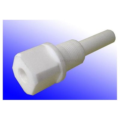 Teflon injector is designed for the injection of concentrated acid.  Excellent choice for injection of concentrated sulfuric acid. Constructed from 100% virgin Teflon material. Allows for injection of concentrated acids and directs flow away from pipe walls and threaded injection port and into the turbulent flow stream for maximum chemical diffusion. Able to withstand the heat of dilution of concentrated acids into water. Designed for flow rates up to 15 gal/hr [56 Liters/hr]. Works with pipes up to 12" [300 mm] in diameter.