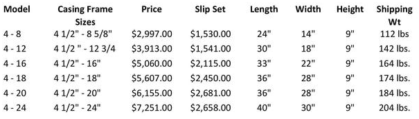 Height is to top of linkage. Handle is removable and can be installed at either end of holder. TekMark Pneumatic/Hydraulic Casing Holder add $600.00 to any model. Removable Side Plate add $366.00. Model Size is dictated by the maximum casing size that will fit into a particular Holder Frame. Note that slips designed to fit a small frame size such as 4 - 8 are less expensive than the same size slips to fit Model 4 - 26. Some drillers prefer to have several different sized models particularly if they have multiple rigs.