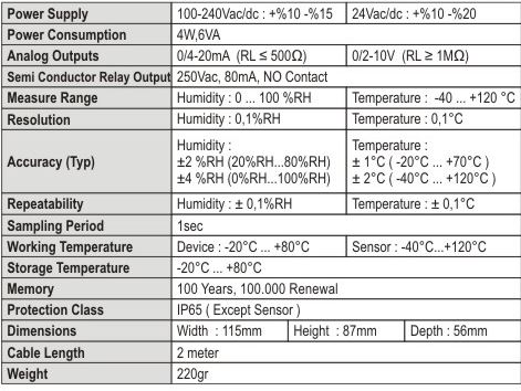 Replaceable Sensor. Replaceable Sensor Filter. Calibrated Single Chip Temp + Humidity Sensor. Approved Capacitive Sensor Technology. High Output Accuracy. 2X4 Digit Numeric Display. 4 Led Indicator. 2 Analog Output (0/4-20mA, 0/2-1OV). 2 Programmable Semi Conductor Relay RS485 Communication Unit. 100-240Vac Universal or 24Vac/dc Power Supply. -40°C...+120°C Sensor Working Temperature Range. Isolation Between Input/Output and Power Supply Units. Temperature, Relative-Humidity , Dew Point Measure and Control. Calibration Ability of Temp., Relative Humidity Selection from two points. Able to Set Sensor Heating Function. Sensor Error Detection and Routing. 4 Different Relay Function for Control or Alarming. Standard MODBUS RTU Communication Protocol. Adjustable Scale for Analog Output. 1sec Sampling and 100ms Control Period. IP65 Protection Class (Except Sensor). 3 Years Warranty for Manufacturing Errors.