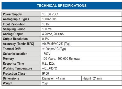 Wide Range Power Supply (10...36VDC). Wide Range Working Temperature (•40...+85°C). 16 Bit Input Resolution. 100 ms Sampling Period. High Output Accuracy. Compatible for DIN43729 Form B Sensor head. 1500V Galvanic Isolation. Protected for Cross Connection. Free Configuration Software (CoNiOl). USB Configuration Without Power Supply. Selectional Level Range. 4-20mA or 20-4mA Optional Output. Selectional Sensor- Error Level. Adjustable Response Time (0,2 ...120s). 3 Years Warranty for Manufacturing Errors.