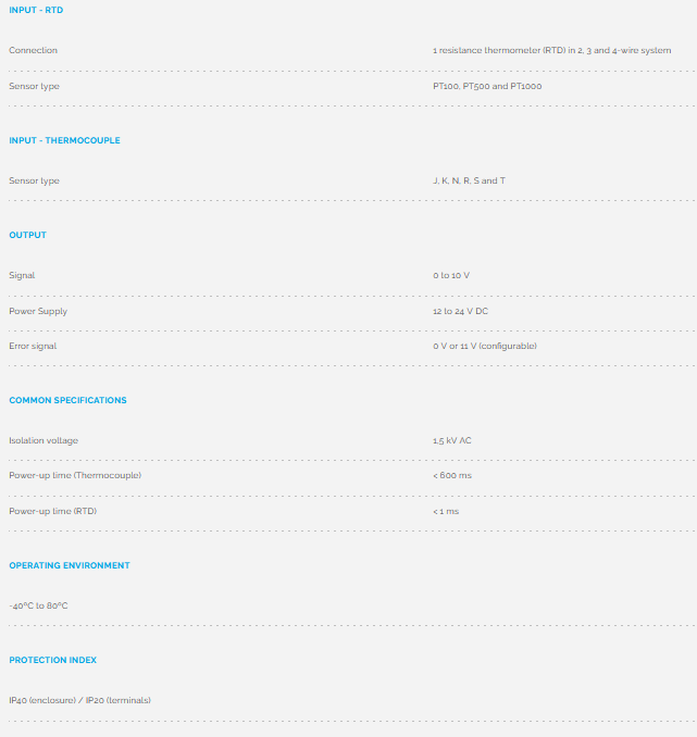 The Tekon Electronics Universal Temperature Transmitters are specifically designed to meet the most rigorous requirements of ope ration in the industrial process environments. TDU302-I is an ultra-flexible universal temperature transmitter which accepts the most commonly used temperature sensors (resistance thermometers with 2, 3 or 4-wire system and thermocouples) and generates a linear 0 to 10 V voltage signal with high stability as output