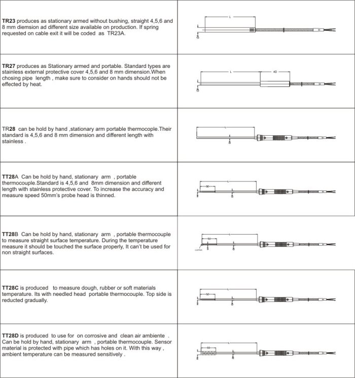 They are used in surface temperature .ambiente temperature and many other measurement applications. Generally . they are producted as stationary armed. Cable type and length should be indicated when ordering.