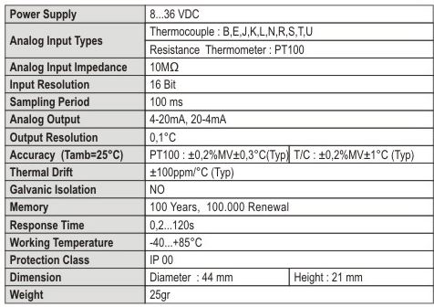 Wide Range Power Supply (8...36VDC). Wide Range Working Temperature (•40...+85°C). 16 Bit Input Resolution. 100 ms Sampling Period. High Output Accuracy. Compatible for DIN43729 Form B Sensor head. Protected for Cross Connection. Free Configuration Software (CoNiOl). USB Configuration Without Power Supply. Selectional Input Types (PT100 and Thermocouple types). Adjustable Temperature Range. 4-20mA or 20-4mA Optional Output. Selectional Sensor- Error Level. Adjustable Response Time (0,2 ...120s). 3 Years Warranty for Manufacturing Errors.