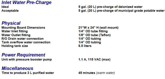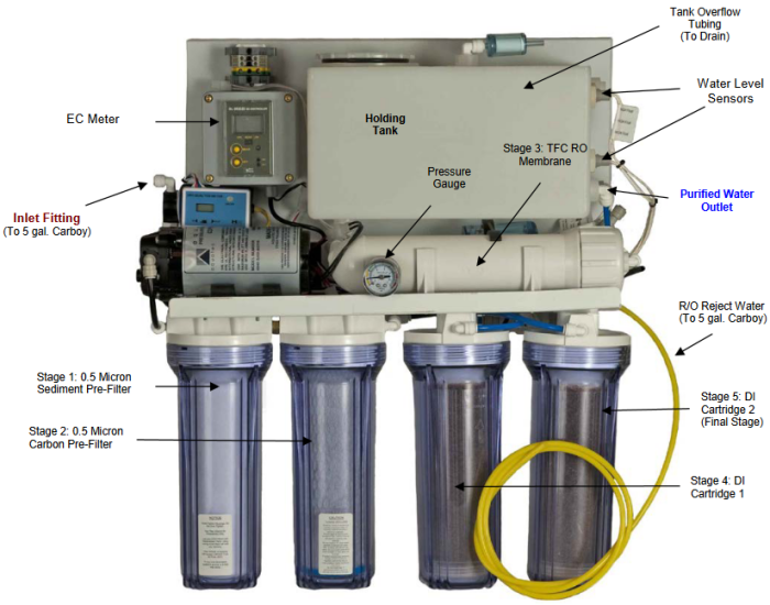 The Tekrarr Model 1308 Recirculating Water Purification System is an inexpensive, convenient source of deionized, mercury-free water for the Series 3300Xi Mercury CEM. The system has two stages of pre-filtration to eliminate all particulate and organic contamination in the water. A reverse osmosis (R/O) unit then removes the bulk of ionic material. Two stages of finishing ion exchange (IX) resin filters then remove any remaining ionic compounds, including mercury. The R/O unit ensures that the final IX filters have extremely long life. The Model 1308 can supply enough water for up to four CEM systems. The long-life filter elements are simple to change, inexpensive, and can last for several years. (Lifetime may vary depending on original water charge supplied and flue gas matrix)