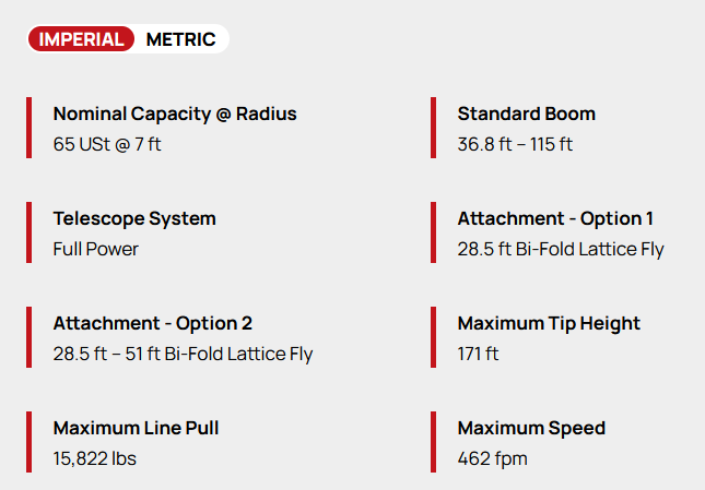 36.8 ft – 115 ft full-power greaseless formed boom (five feet longer than predecessor). 28.5 – 51 ft two-piece onboard fly. Full fly is stowable on the machine, and no capacity deducts for stowed attachment. 171 ft maximum tip height with full attachment. Transports fully equipped at under 84,000 lbs with 18,400 lb counterweight.