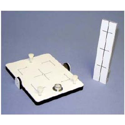 The TEL-ALIGN™ consists of a rectangular plastic base with a removable vertical scale. The top surface of the base contains lead markers that form a square (10 x 10cm) for visualization on film. A cross hair in the center of the square lines up with two additional sets of cross hairs, one on each outer edge of the base.