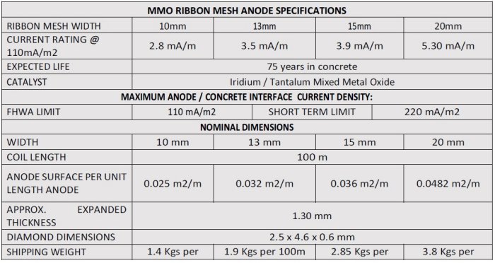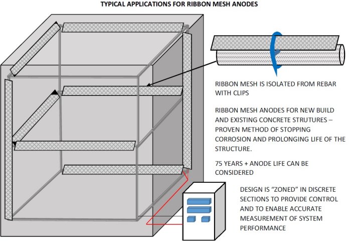 TELPRO RIBBON MESH ANODES  are manufactured from ASTM  B265, Grade 1 Titanium and coated with Telpro Mixed Metal Oxide Coating. Typically these anodes are used in the protection of steel rebar embedded in concrete / mortar. The use of Impressed Current Cathodic Protection systems has been proved to be a very effective way of controlling corrosion of rebar, particularly in hot and saline conditions. There are four standard sizes of Ribbon Mesh available with a variance in current output between them. Anode life is typically 75 years although greater lifetimes can be accommodated.
