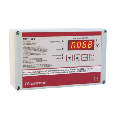 The MMT-1000 measures the water temperature, in the supply line from a boiler, with a temperature sensor of type Pt-100. MMT-1000 has a programmable cut-off limit and breaks up the safety circuit and gives alarms if the temperature exceeds the set cut-off limit
