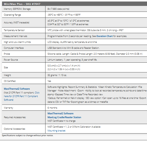 The Min-Max Plus is a reliable cost-effective digital temperature recorder that is ideal for laboratories, blood banks needing low-cost real-time information. It has an external 2 meter (6.56 ft.) probe that can measure temperatures as low as -35°C