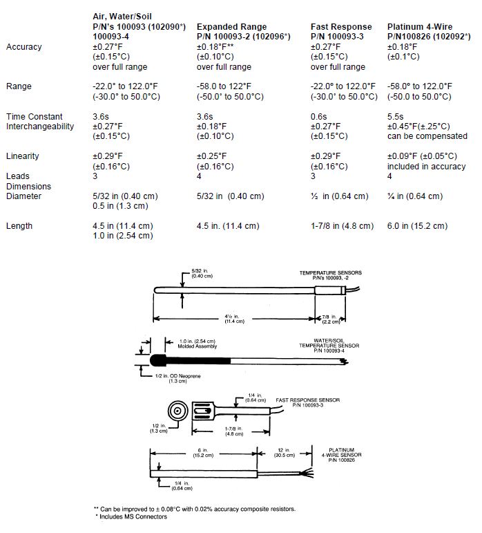 Capable of meeting virtually any ambient measurement need, Climatronics’ temperature sensors are accurate durable, and linear over a wide range, can be provided with NIST traceable calibration, and are well matched for high accuracy delta temperature applications. The Air, Water/Soil, and Expanded Range Sensors encase a thermistor bead in a stainless steel or vinyl sheath. This casing, combined with Climatronics’ temperature shield, gives the thermistor bead protection from solar radiation, precipitation, and corrosive, airborne particles. Such configurations transfer heat as rapidly as possible, yielding a typical time constant of 3.6 seconds. When direct exposure of the thermistor to the media being measured is permissible, our Fast Response Sensor reduces the time constant to a minimal 0.6 seconds.