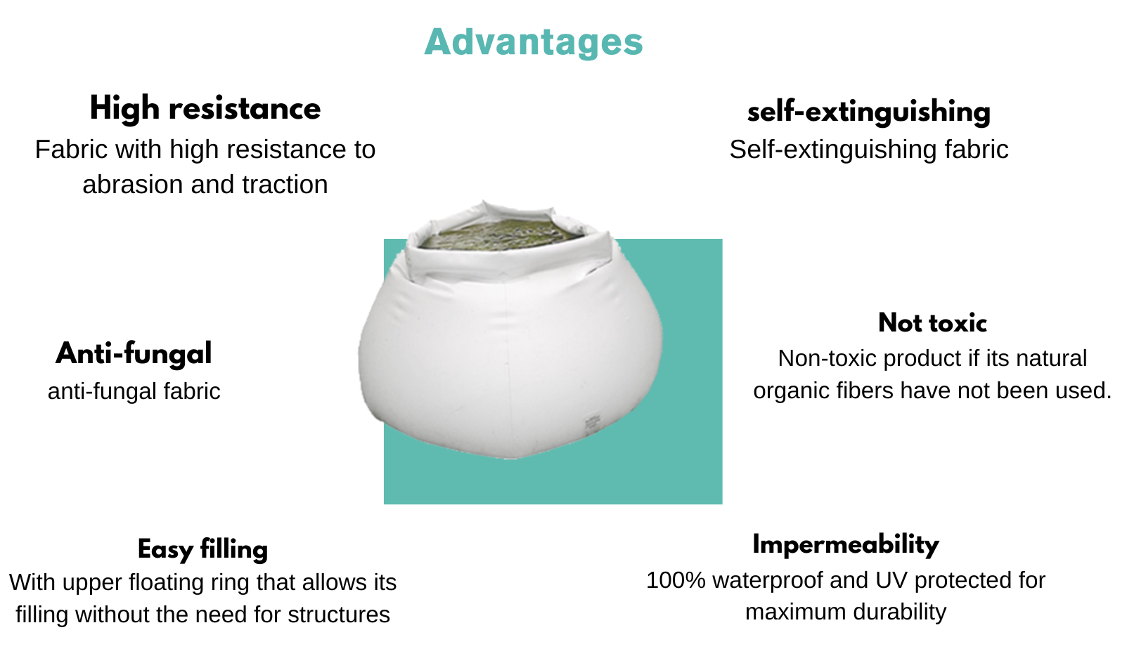 50,000 L made with a double PVC membrane with internal polyester support, high-frequency electronic sealing, fabric with high resistance to abrasion and traction. Self-extinguishing and anti-fungal.