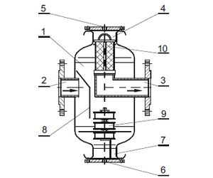 In DN15-150 strainers, the medium is transferred via an inlet port (2) and a baffle (8) to the bottom of the tank, into the zone affected by the magnetic field of magnetic inserts (9) installed in the ports (7) (TerFOM and TerFM only). The medium flow rate and pressure are reduced with simultaneous precipitation of solids and removal of air bubbles. Since a strainer (10) is installed in the top tank section, the blowdown is carried out at the entire tank capacity. The strainer for filtering medium is installed in the outlet port elbow (3). The air bubbles are removed from the strainer surface via a relief port (5) (automatic relief). The solids are removed via a drain port (6). In DN200 strainers, water is transferred via an inlet port (2), and separated into two streams (up and down the tank). The medium flows into the zone affected by the magnetic field of magnetic inserts (9) installed in the ports (7) (FOM and FM version only). The medium flow rate and pressure are reduced with simultaneous precipitation of solids and removal of air bubbles. The medium flows via an outer collector (11) to an outlet port (3). The air bubbles are removed from the strainer surface via a port (5). The solids are removed via a drain port (6).