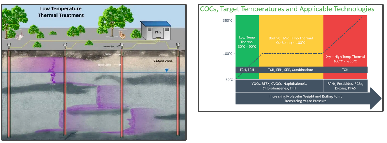 - Low temperature thermal treatment can be used to address sites with low mass or concentrations of select VOCs and SVOCs, BTEX, CVOCs, and LNAPL/TPH, and where remedial timeframes are longer (e.g., 2-3 years).