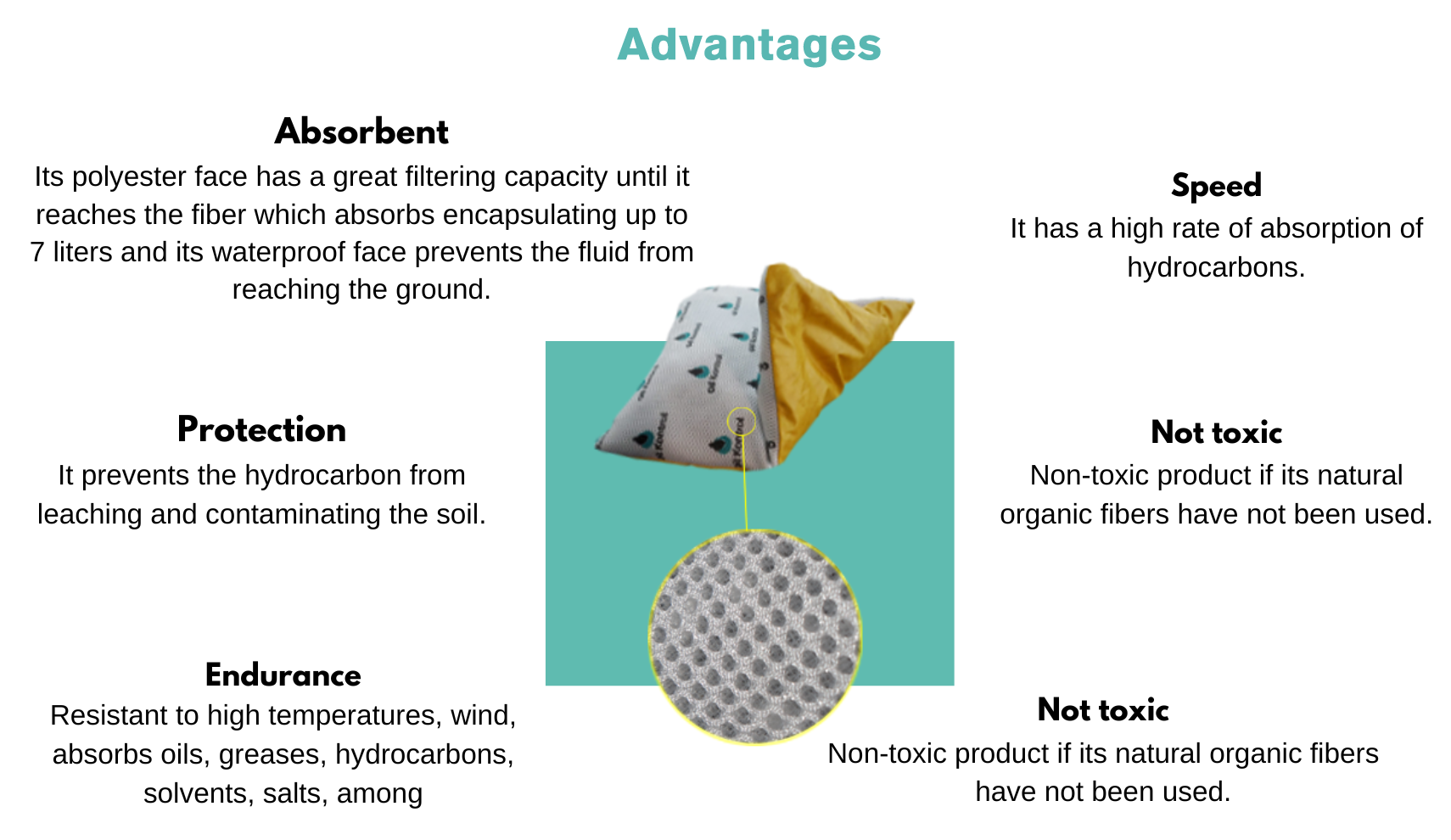 They are pads with 3D polyester fabric covers, with a waterproof fabric base, filled with 1kg of bio-absorbent fibers, to be used in spills on land, oil leaks from machinery or engine maintenance, acting as oil collectors. and hydrocarbons in general. It absorbs and encapsulates up to 7 liters of hydrocarbons depending on its density and viscosity.