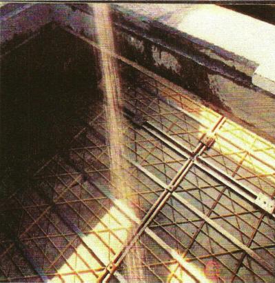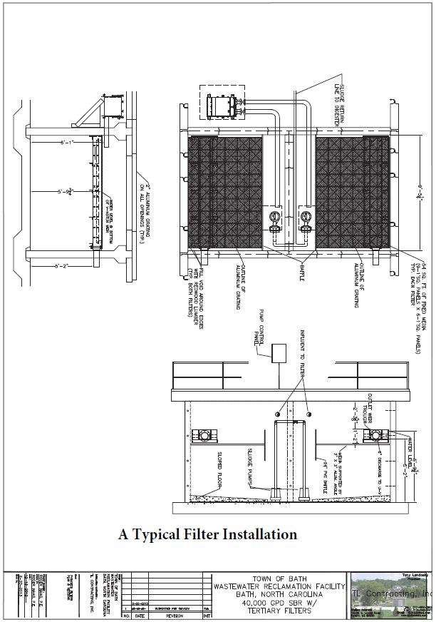 One reinforced precast concrete fixed media filtration tank shall be supplied to remove suspended solids and B.0.D. from the effluent from a secondary sewage treatment plant. This filtration process is an upflow design through a uniform grid. As the liquid flows upward through the uniform grid (Pyradeck), a velocity change takes place that causes the solids to settle on top of the grid. When the solids are dropped out of suspension, a solid blanket forms on top of the media to further enhance the filtration process. As the suspended solid removal rate increases, a B.O.D. reduction takes place that further purifies the effluent. The unit can be cleaned by lowering the liquid level below the media and having the solids fall through the media to the bottom of the tank. Lowering the water level is accomplished by turning on the backwash pump. Complete cleaning of the tank is done by running the backwash pump until the tank is emptied. The filtration tank shall consist of two cells operating in parallel each having (insert no.) square feet of Pyradeck (fixed media), one inlet weir, one inlet baffle, redwood bracing for the media support, one 6″ adjustable outlet weir, and one (1) submersible pump in each cell be used to backwash media. Backwash is to be returned to sludge holding tank at the operator’s discretion.