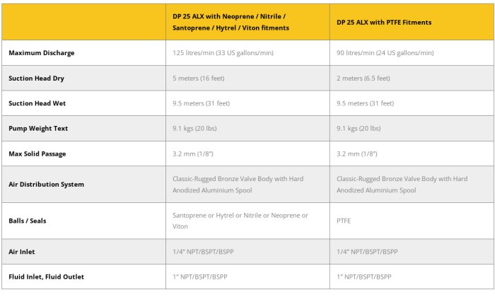 Teryair aluminium constructed pumps are commonly combined with Neoprene, Nitrile, Santoprene, Hytrel, Viton or PTFE Elastomers. With these elastomers they are ideal for pumping of water and water-based fluids, non-aggressive fluids, oily fluids and fluids having low acidic or alkali concentrations Aluminium Pumps offer a relatively low-cost solution to many pumping applications. For this purpose, the main industries that choose Aluminium pumps are Paints, Marine, Mining, Ceramic and Wastewater/Pollution management.