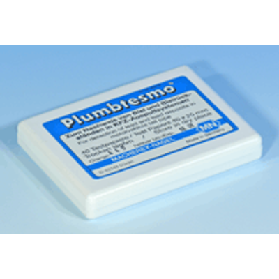 This test paper is recommended for the detection of metallic lead and lead salts on surfaces and in solutions. Plumbtesmo is white when dry and turns yellow when wet (must be moistened prior to the test). Lead is indicated as pink to deep red-violet coloration. Plumbtesmo is also used as an indicator for lead in automobile exhaust pipes, when leaded gasoline has been burnt. Interference by tellurium, silver, cadmium barium and strontium can be circumvented. Limit of sensitivity: 0.05 microgrm on surfaces or as a lead salt in solid form; 5 ppm lead2+ in solutions.