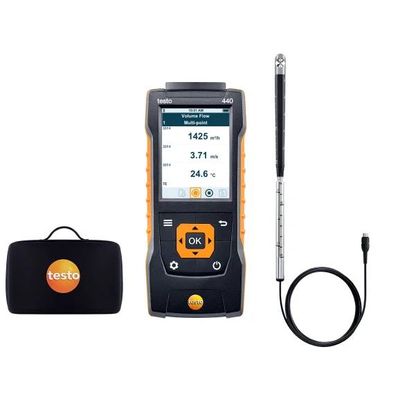 - testo 440 air velocity and IAQ measuring instrument, 3 AA batteries, USB cable, and calibration protocol (0560 4401)
