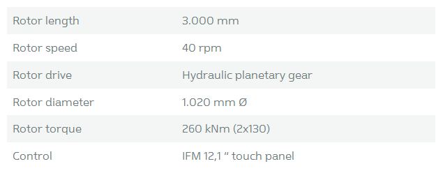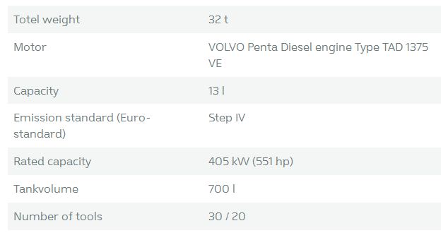 Motor: VOLVO Penta Dieselmotor Type TAD 1375 VE. Total weight: 32 t (Mobile Version) / 34 t (Track Version). Number of replaceable teeth / shredding rotor: 30. Control: IFM with 12.1 “ touch panel + Remote Control. Tank volume: 700 l.