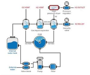 Deionised or distilled water is pumped into a polymer electrolyte membrane (PEM) cell. Within the PEM cell Electrolytic Disassociation splits the water into Hydrogen and Oxygen. The Oxygen is vented safely from the system whilst the Hydrogen proceeds through the system. After passing through a gas/liquid separator the hydrogen gas enters a desiccant chamber to remove the last traces of water from the gas. The hydrogen then passes to the application via a pressure regulator.