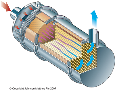 The CRT system is the most widely used DPF system in the world and is a patented Johnson Matthey technology. It comprises an oxidation catalyst followed by a DPF. The principle of its operation is shown below.
