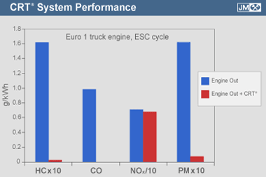 This chart shows the emissions reduction achieved by a CRT system fitted to a Euro 1 truck engine over the ESC 13-mode cycle. The conversions shown are typical of the performance of a CRT system.