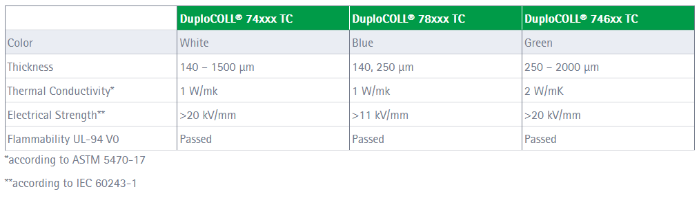 DuploCOLL® TC acrylic transfer tapes offer a thermal conductivity of up to 2 W/mK for an efficient heat transfer between electronic components. They are free of silicones, halogens and solvents and provide immediate adhesion even to irregular surfaces, realizing excellent surface wetting.