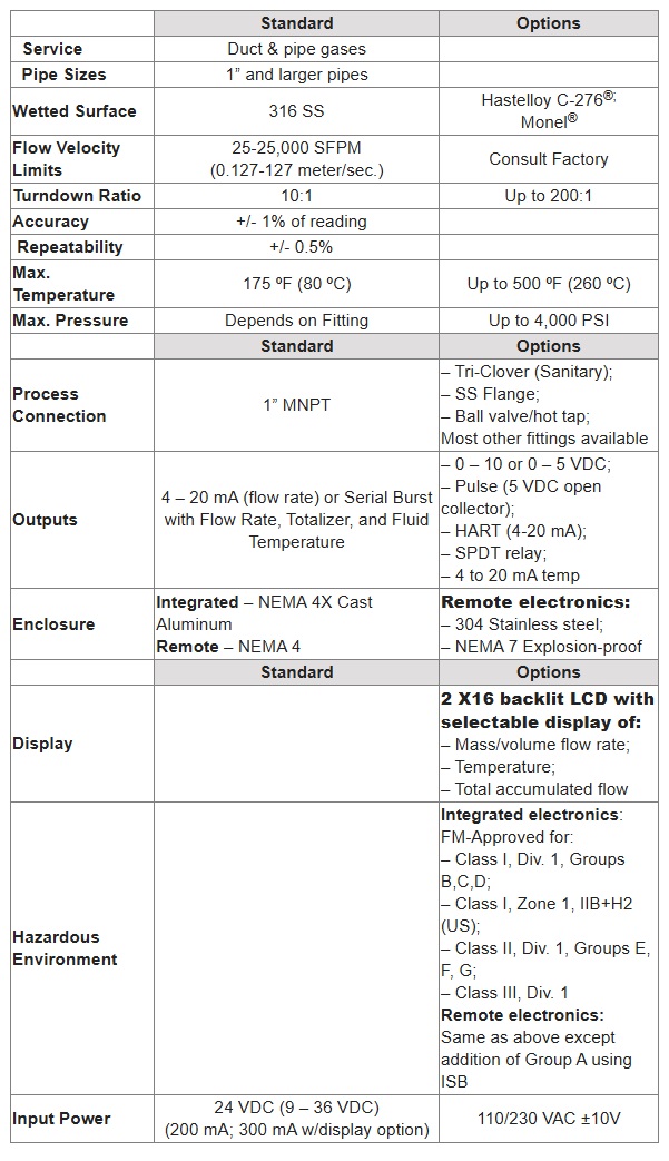 Air and most other non-condensing gases, including corrosive and explosive gases. The stainless steel construction and lack of moving parts make it ideal for rugged industrial environments. Common uses include vent air, stack gas and digester gas. The application section has a complete list of fluids. Contact Us about any application you have or use the form on this page.