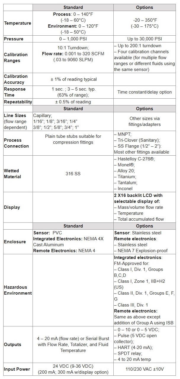 These gas flow measurement instruments give a repeatable reading in mass or standard volume, without needing external temperature or pressure correction. With no mechanical parts, they are reliable and easy to maintain. We also provide low flow meters for gas measurement in hazardous environments, including intrinsically safe and NEMA 7 explosion-proof models. Please visit our Instruments for Hazardous Locations page to learn more about NEMA 7 explosion-proof models.