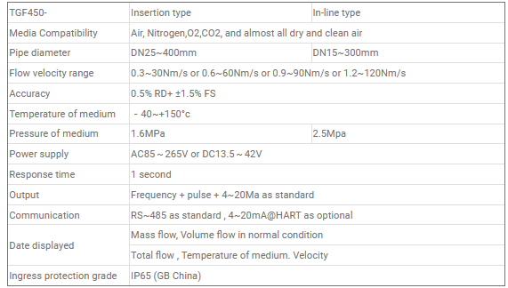TGF450 thermal mass flow meter is a measurement solution specially designed for compressed air, nitrogen gas, oxygen. Provide a stable and accurate measurement at a more economical cost. The compact design and thick probe are easier to be installed under pressure pipeline with limited room.
