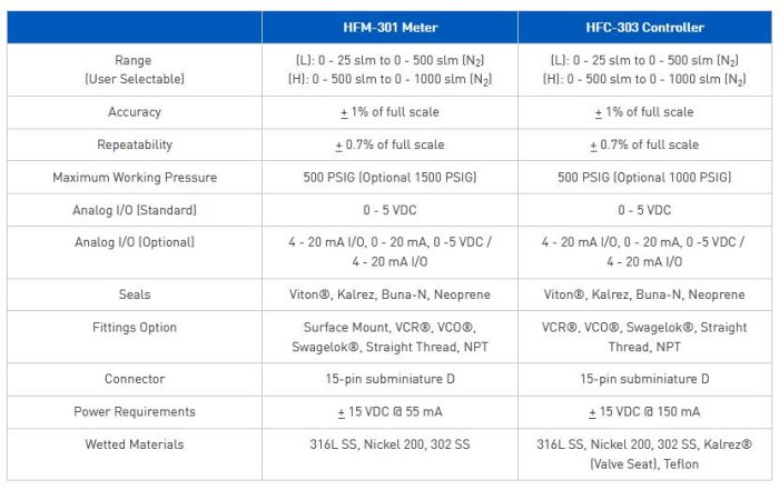 The HFM-301 / HFC-303 meters and controllers have flow ranges from 0-25 slm to flows of 0-1000 slm; provide analog outputs, are constructed of stainless steel and have normally closed valves. The full scale range is specified by the end user. A NIST traceable calibration certificate is standard. With a choice of elastomers and high pressure options, the HFM-301 / HFC-303 services a wide variety of applications. Cleaning for oxygen service is available.