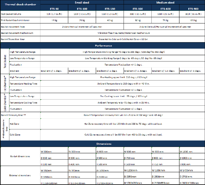 ETS-Series air-to-air and liquid-to-liquid Thermal Shock Test Environmental Chambers from Envisys are available in different volumes to suit the varied testing needs. Horizontal or vertical models consisting of cold and hot zones with product carrier basket of sizes 50, 100, 150, 300, 600 and 900 liters which transfers the specimen under test between cold and hot zones using electro pneumatic / motorized basket movement.