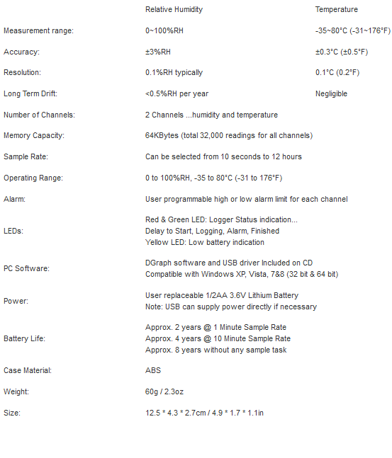 HICSSN-22 Data Logger is the perfect tool for stand alone or cold-chain monitoring and documentation of temperature and relative humidity conditions that are critical in laboratories, pharmaceutical, medical, storage, freezers, coolers, shipping containers, warehouses, environmental monitoring and food storage applications. The HICSSN-22 can measures and record up to 16K temperature readings over -35 to +80°C (-31 to +176°F) and 16K relative humidity measurement from 0 to 100%RH. The integral USB connector easily plugs into a computer for quick data analysis using the included DGraph software. Real time monitoring of temperature and humidity values are displayed in the integrated LCD screen. The data logger is supplied complete with a long-life lithium battery, which can allow logging for over 2 years, and configuration software, compatible with Windows XP / Vista / 7&8.