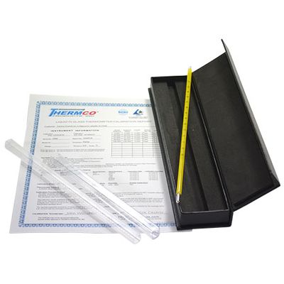 Thermco’s Certified Thermometers are used in temperature verification and calibration procedures. These instruments can be used to calibrate Liquid-In-Glass, RTD, Thermistors, Thermocouples, and Bi-Metal Thermometers. The certified thermometers are carefully inspected to insure they conform to exact specifications and are certified against NlST standards. Each thermometer is furnished with a document proving traceability and a felt-lined leatherette storage case.