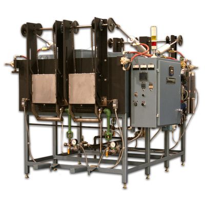 This Dual Chamber Front Loading Box Furnace also has two doors in the rear for unloading. Designed for heat treating in an oxygen free environment, this furnace has an atmosphere control system with flame curtains low explosion level detection.