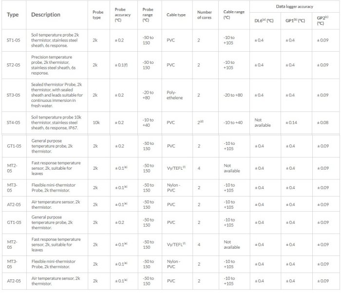a: Additional (worst case) error due to DL6 Data Logger at -10 to +50 °C. b: Additional (typical) error due to GP1 Data Logger at 0 to +60 °C. c: Additional (worst case) error due to GP2 Data Logger at -20 to +60 °C. d: Co-axial single-core with screen acting as signal loop. e: Over 0-70 °C. f: Teflon lead, vinyl tip.