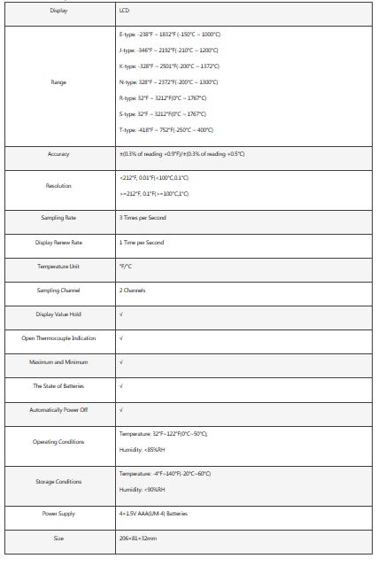 It is a high-precision of dual-channel digital thermocouple thermometer, which uses thermocouples as sensors to measure temperature signals. 0.01Resolution. Optional infrared for temperature measurement. The types of thermocouple supported by the meter are: E-type, J-type, K-type, N-type, R-type, S-type, T-type, can meet the needs of different industries.