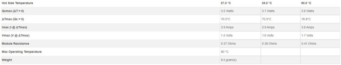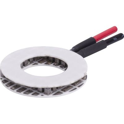 The RH14-14-10-L1-W4.5 is an annular thermoelectric cooler that is round in shape. The hot and cold side ceramics have a circular hole in the center to accommodate light protrusion for optics, mechanical fastening or temperature probe. It has a maximum Qc of 3.5 Watts when ΔT = 0 and a maximum ΔT of 70.5 °C at Qc = 0.