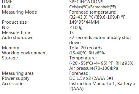 1 Multiple purposes This non-contact infrared thermometer can be applied to the forehead. The forehead temperature range is from 32 ° C through 43.0 ° C (89.6-109.4 ° F).