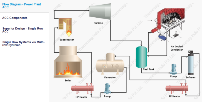 A form of condensing equipment that uses ambient air as a cooling medium to condense turbine exhaust steam straight into water using air-cooled bundles. Due to its excellent water saving performance compared to other types of condensing/cooling systems, the air cooled system is an increasingly extensive application worldwide.