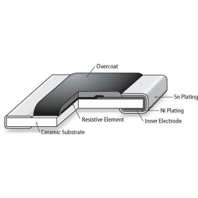 Thick film chip resistors are made of a thick film resistive layer printed onto a ceramic substrate. The thick film resistive layer is a mixture of metal oxides. Surface mount chip resistors have electroplated tin (Sn) outer terminations for board soldering. The resistive element is protected by an epoxy overcoat layer.