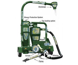 The pressure from the bottom of the blower pushes through the airlock, moving the material out to your truck or bin.