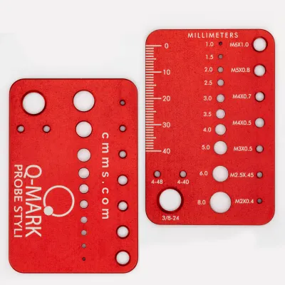 End the guesswork over the correct thread and ball sizes for your probe system. Our thread card has ten tapped holes between M2 and 3/8-24 to check the thread size, and ten holes ranging from 1.0 to 6.0 mm to gauge the ball size. A built-in 40 mm engraved scale confirms the stylus length. We make these in the USA from aircraft grade aluminum that is machined, deburred, red anodized, and laser engraved. Protective slip cover included.